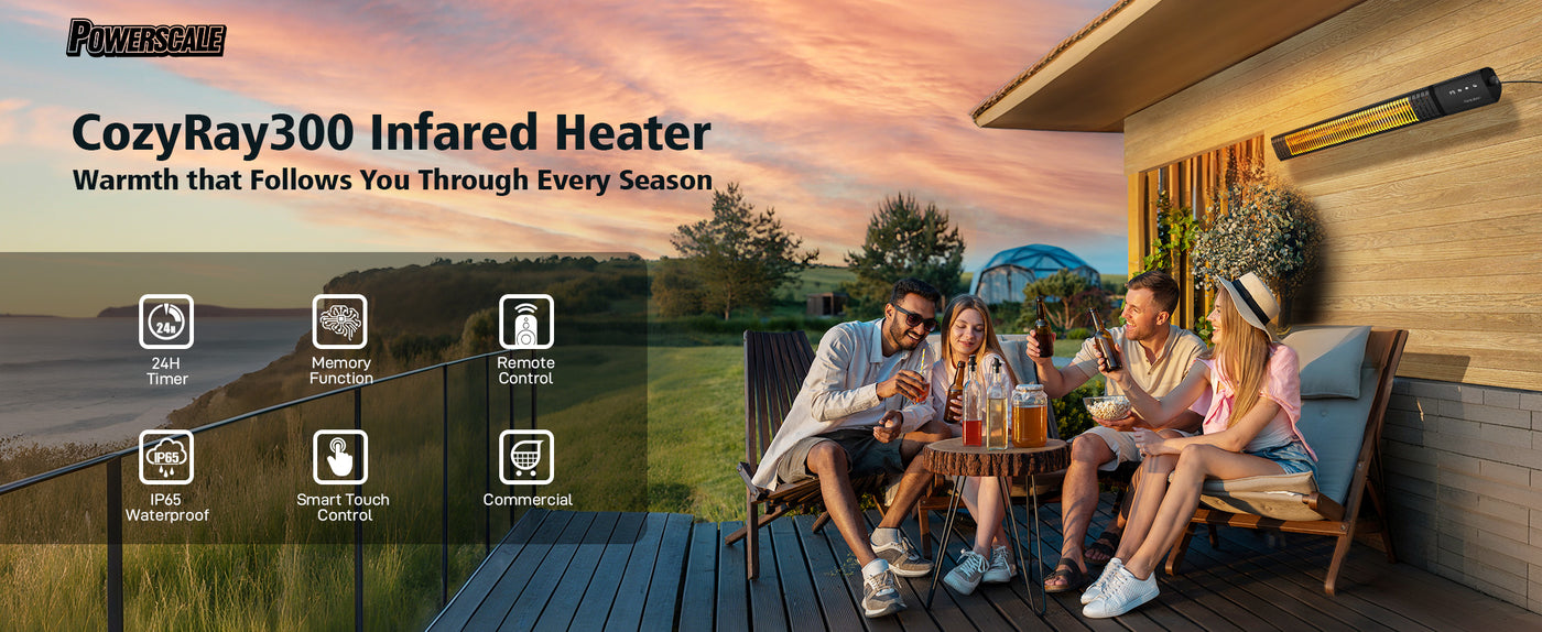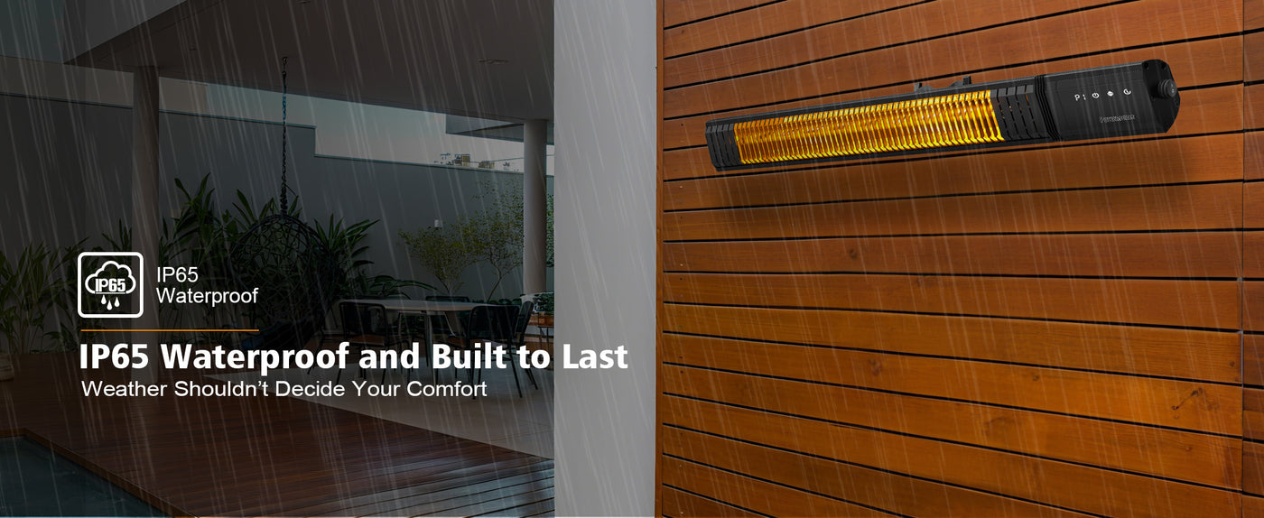 - Built to Last Through All Weather Conditions Engineered with IP65 waterproofing and a tough powder-coated aluminum body, the Cozyray 300 is built for year-round use. Rain, wind, or dust—this outdoor heater keeps working reliably. It's an excellent replacement for traditional fireplace heaters, portable heaters, or pellet heaters for outdoor use—providing dependable warmth no matter the season.
