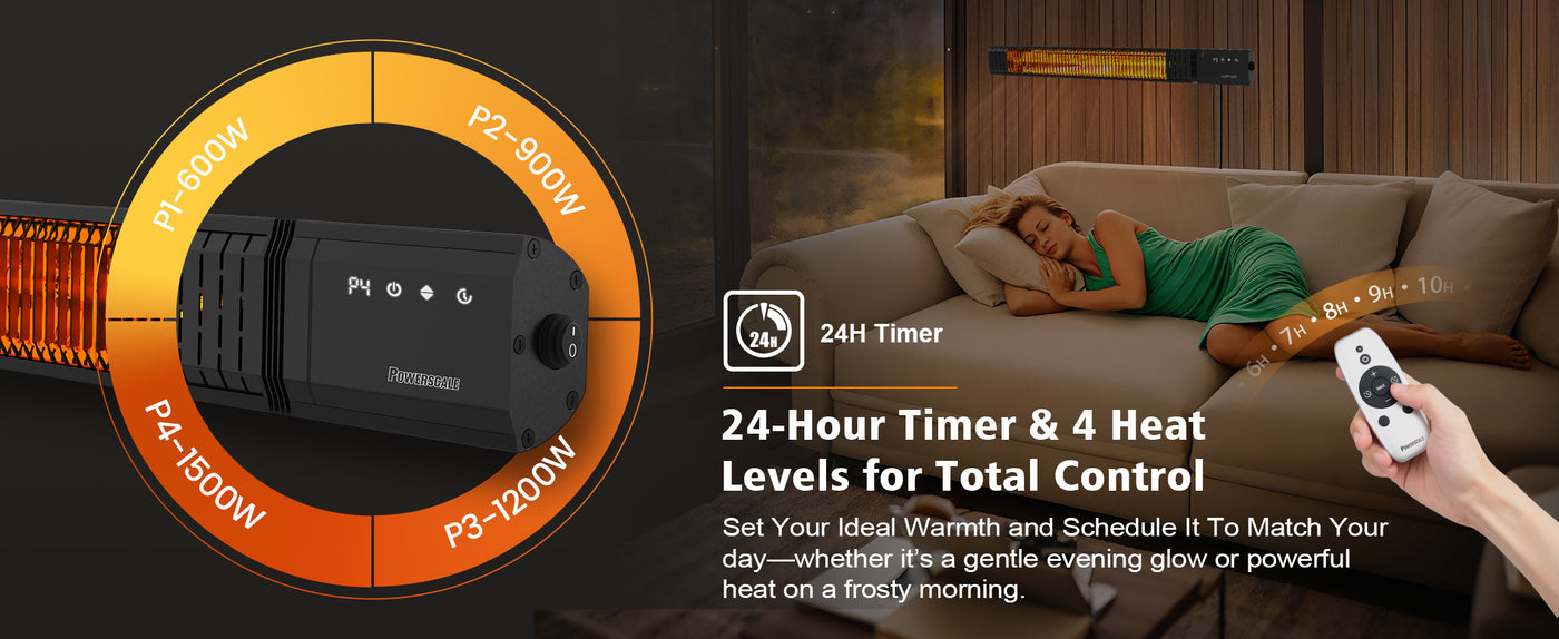 - 4 Heat Levels and 24-Hour Timer for Personalized Comfort With four adjustable heat settings and a 24-hour timer, this patio heater lets you set the perfect temperature for any situation. Whether you're using it as a heater indoor or outdoor heaters for patio, the memory function recalls your last setting—making comfort just a click away. No more re-adjusting every time you turn it on.